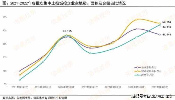 与此同时,今年第三批次集中土拍之前,城投企业拿地宗数、面积与拿地金额占比走势保持一致,不过,进入2022年第四批次,受第四批次整体供应体量偏低的影响,城投拿地规模的占比有所下降,但仍处于7批次集中土拍的高位,且占比超4成。