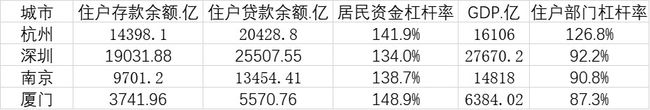 不同地区、不同城市,居民资金杠杆率、住户部门杠杆率也呈现较大差别。总体上,我国城市居民杠杆率呈现南高北低的格局。根据排名前列财经记者统计,在重点城市中,厦门、深圳、南京、杭州等东南沿海城市杠杆率较高。