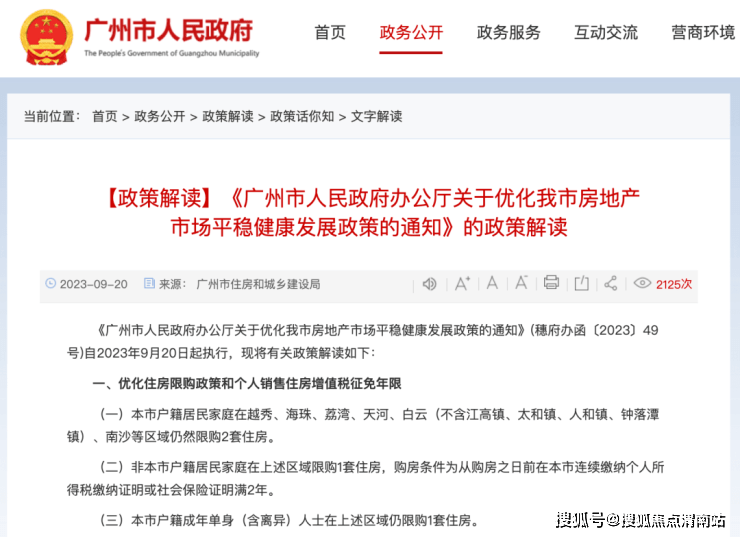 9月20日,广州市人民政府办公厅发布了《关于优化我市房地产市场平稳健康发展政策的通知》,明确优化住房限购和增值税免税年限,成为首个明文放松限购的一线城市。