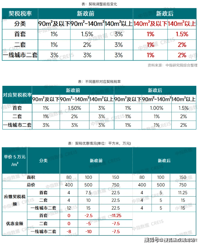 据中指研究院测算,以单价5万元计算,面积分别为80、100、150平方米为例,此次新政后,首套契税分别优惠0万元、2.5万元、11.25万元,二套分别优惠0万元,5万元、7.5万元,北上广深二套分别优惠8万元、10万元、7.5万元。