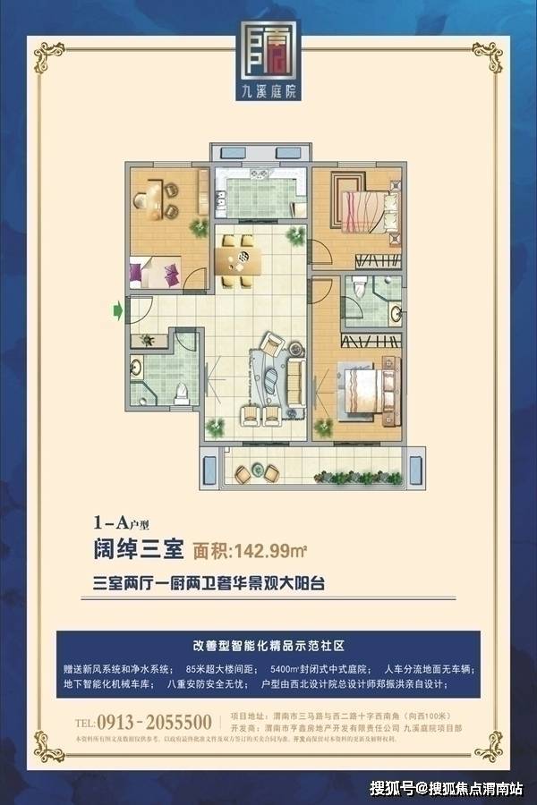 九溪庭院项目占地21亩, 约5400㎡园林,由两栋住宅组成。九溪庭院位于临渭区金水路与胜利大街交汇处西100米,作为渭南核心区的改善型社区,优越的地理位置和丰富的社区配套,项目采用全封闭管理,八重安防。外墙红外线检测、360°电子监控、车库入口电子识别、小区入口电子识别、单元入口对讲电子识别、电梯刷卡,入户门人脸识别、24小时安保新风/净水系统,85米超宽楼间距。