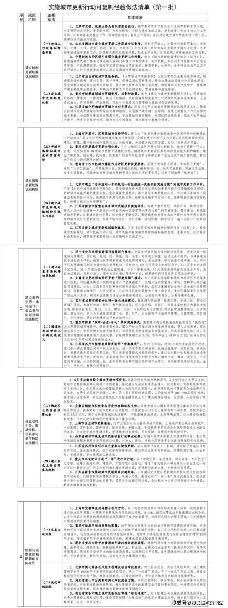 清单从建立城市更新统筹谋划机制,建立政府引导、市场运作、公众参与的可持续实施模式,创新与城市更新相配套的支持政策等方向分别给出了北京、上海、重庆、苏州等城市更新试点城市可借鉴参考的经验做法。