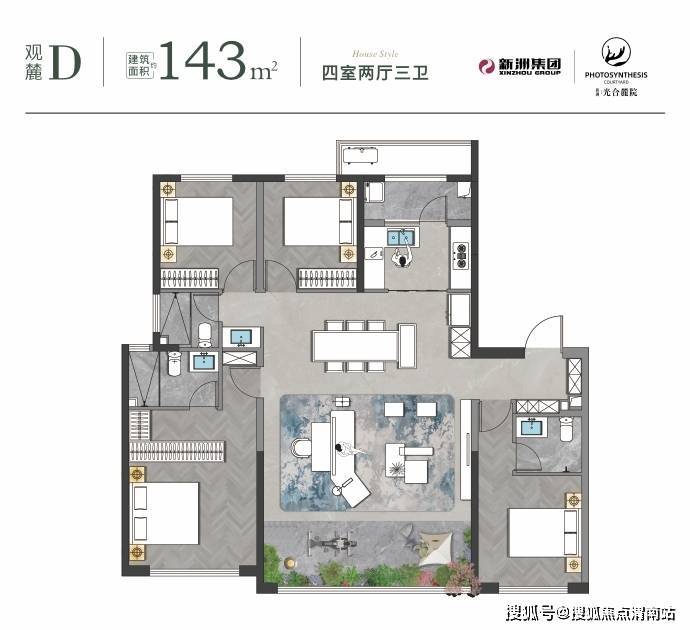 新洲·光合麓院以南京涵碧楼、青普文化行馆等顶级酒店为灵感蓝本,提炼出“气质、艺术、度假、自然”四重设计维度,从门头到院落,每一处细节都遵循“藏风聚气”的东方格局:项目主入口采用“门头内高外低”的格局,五步台阶寓意“连升五级”,配合宇宙黑奢石与水景琉璃幕墙,夜幕降临时,灯光流淌如星河,将归家仪式升华为艺术观览。次入口借鉴酒店车马前厅概念,通过人车分流设计与叠涩内凹门头,营造港湾般的归属感,细节中处处彰显“隐奢”质感。