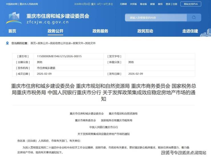中房网讯 (苏晓/文)2月9日,重庆市住房和城乡建设委员会、重庆市规划和自然资源局、重庆市商务委员会、国家税务总局重庆市税务局、中国人民银行重庆市分行联合印发通知,出台22条政策发挥政策集成效应,更好满足群众购房需求、释放住房消费潜力,着力稳定房地产市场。政策涵盖六大方面,自印发之日起实施。