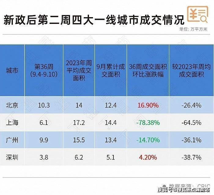 先来看新政后第二周四大一线城市成交情况,第36周(9.4-9.10)四城中仅北京、深圳成交面积环比上周有所上涨,上海和广州则出现明显下滑。若对比2023年周均成交面积,四大一线城市新政后第二周新房成交全线下跌。