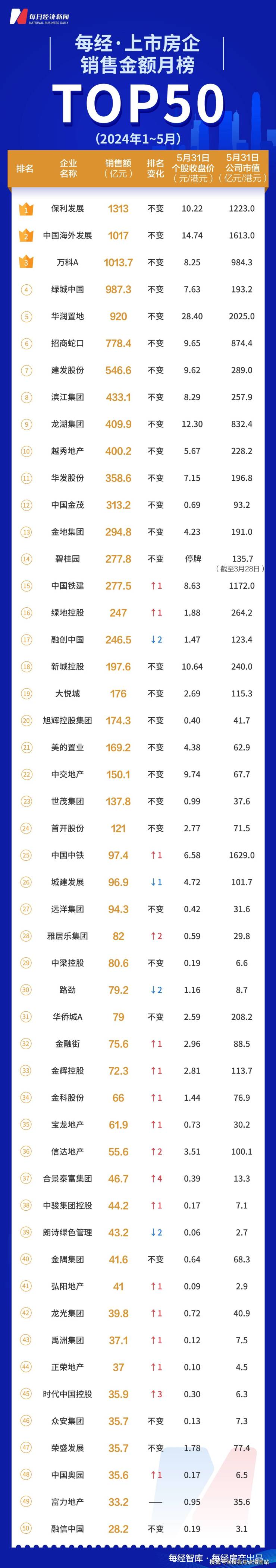 2024年1-5月,TOP50上市房企合计销售额12436.3亿元,5月单月销售额比4月(9686亿元)微增1.4%。