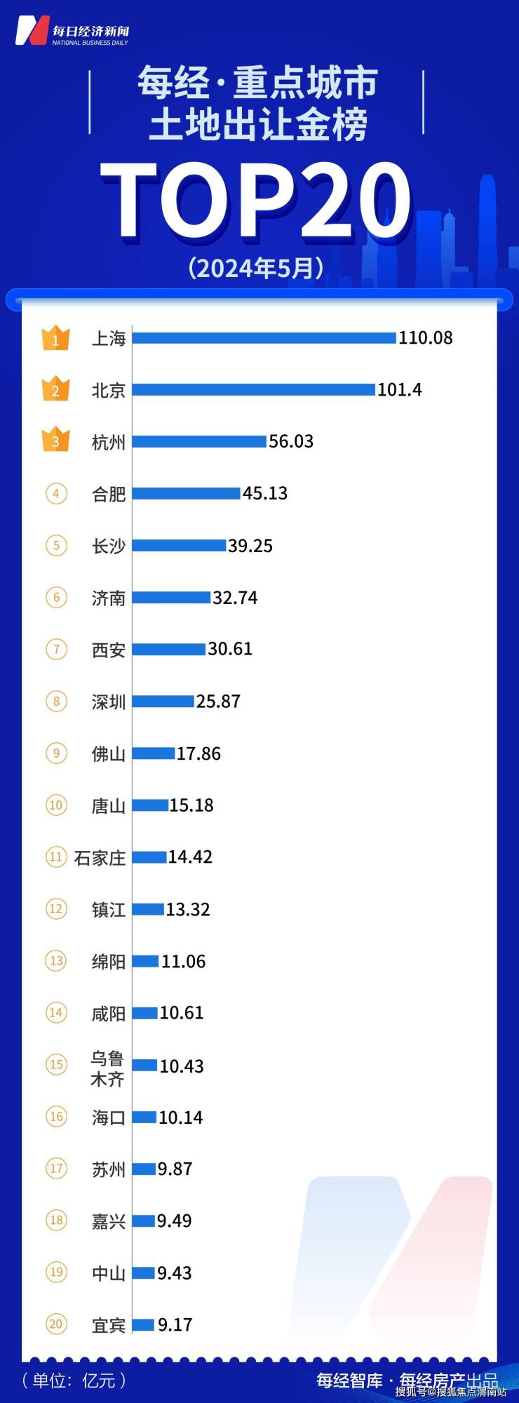 上海、北京、杭州等热点城市土地出让金仍是前三,合计出让268亿元,但热度较4月有所下降。