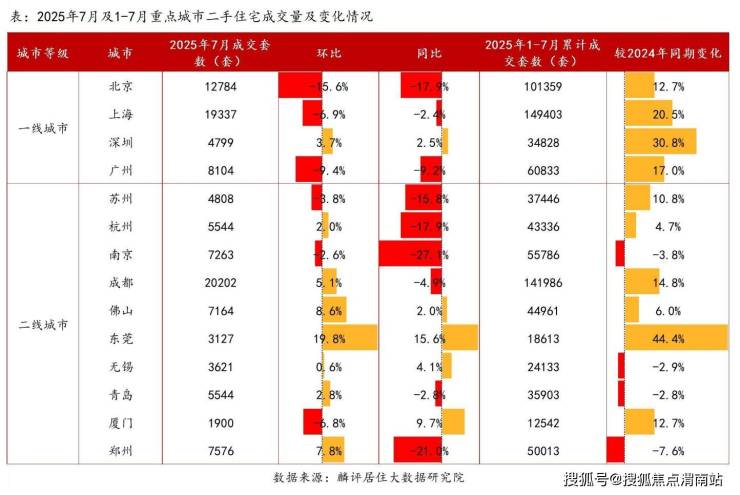 二线城市内部则呈现出分化态势。重点监测的城市中,苏州、南京和厦门7月成交量环比下降,降幅分别为3.8%、2.6%和6.8%,但降幅小于一线城市。其余二线城市的二手房成交量较上月呈现上升局面,其中东莞、佛山和郑州的成交量环比涨幅靠前,分别为19.8%、8.6%和7.8%。