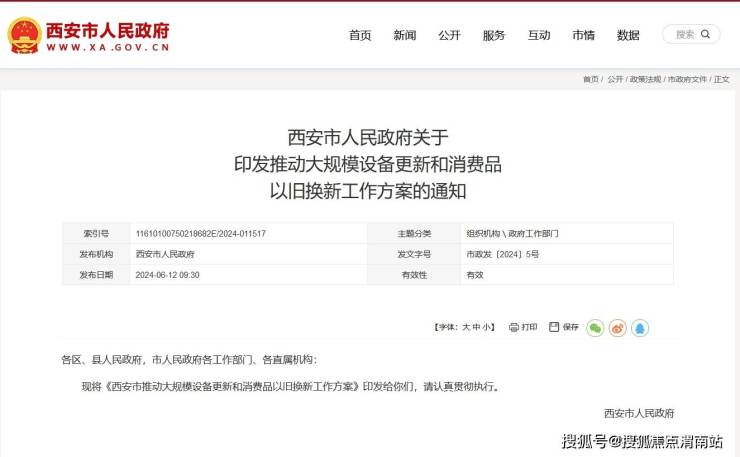 6月12日,西安市人民政府发布关于印发推动大规模设备更新和消费品以旧换新工作方案的通知。