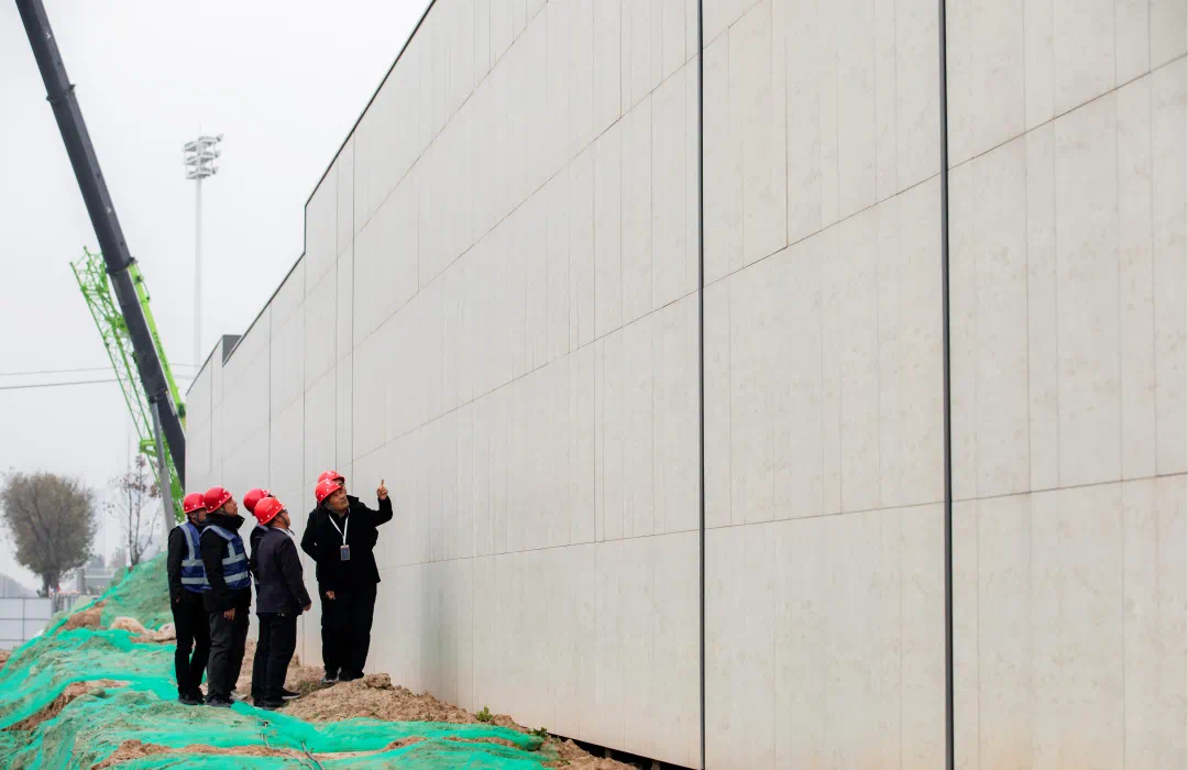 上上地产斥资每米近2万元打造城市景观界面——松韵景墙,规划以黑松、坊墙、坡地草坪三种极简元素,演绎一幅长达300米的立体山水画卷。松韵景墙是上上玫瑰园东方意境的彰显,更是代言城市界面的形象工程,上上地产不吝成本,每一块材料都选用万众雁栖玫瑰园同款沉香米黄石材,每棵松树皆选自千里之外的名贵松种,目前已耗资近千万。目前景墙工程已完成,双方就现场试种的松树景观形态研讨二次优化方案,为实现最优质的景观效果,计划追加百万投入,重新采购更为优质的黑松进行替换。