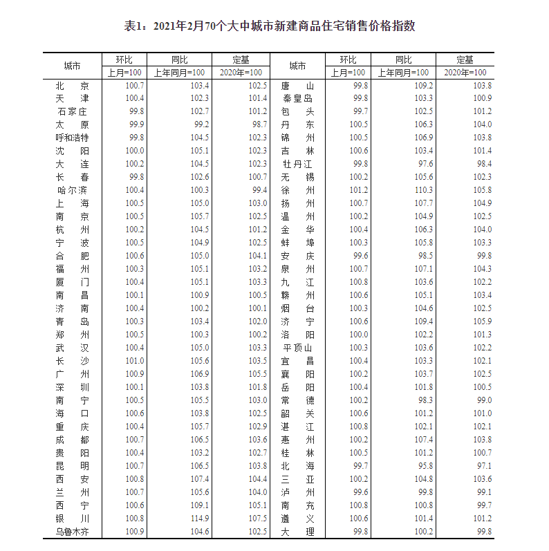 【环球网房产报道】 3月15日,国家统计局披露2021年2月份70个大中城市商品住宅销售价格变动情况。2月份,全国各线城市商品住宅销售价格环比涨幅有升有降,同比涨幅较上月有所上升。