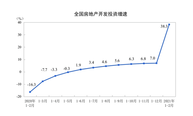 同日,国家统计局还发布了2021年1—2月份全国房地产开发投资和销售情况。1—2月份,全国房地产开发投资13986亿元,同比增长38.3%;比2019年1—2月份增长15.7%,两年平均增长7.6%。其中,住宅投资10387亿元,增长41.9%。