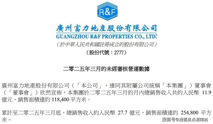 公告显示,2025年3月集团月内总销售收入约为人民币11.9亿元,销售面积约为11.84万平方米。
