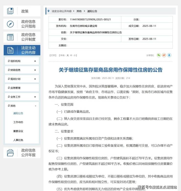 8月11日,东莞市住房和城乡建设局发布《关于继续征集存量商品房用作保障性住房的公告》,明确东莞将在全市范围内,征集条件合适的商品房用作保障性住房。