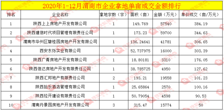 七、2020年1-12月渭南企业拿地单亩成交金额排行情况: