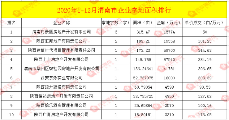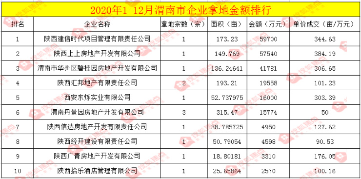 六、2020年1-12月渭南企业拿地金额排行情况: