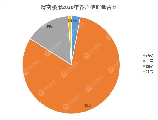 根据搜狐焦点渭南站统计,2020年渭南楼市成交量14497套,其中二室成交占比为3%,三室成交占比为81%,四室成交占比为15%,跃层成交占比为1%。由此可见,渭南楼市市场中三室成主力军。