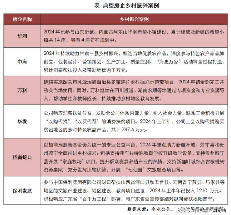 2024年,服务乡村振兴战略是房企履行社会责任的重要内容之一,多家头部房企围绕教育帮扶、消费帮扶、产业帮扶等方向,多措并举推进乡村振兴事业稳健发展。