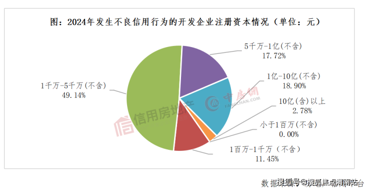 从注册资本来看,2024年发生不良信用信息的开发企业,其注册资本主要集中在1000万元-5000万元(不含)之间,占比达到49.14%,约15778家;其次是注册资本在1亿元-10亿元(不含)以内的企业,占比18.90%,约6069家。