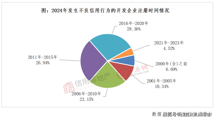 从注册年份来看,2024年发生不良信用信息的开发企业中,注册时间主要集中在2006年-2020年,占比达78.45%,约25536家开发企业;其次是2001年-2005年之间注册的开发企业,占比为10.34%,有3366家开发企业。