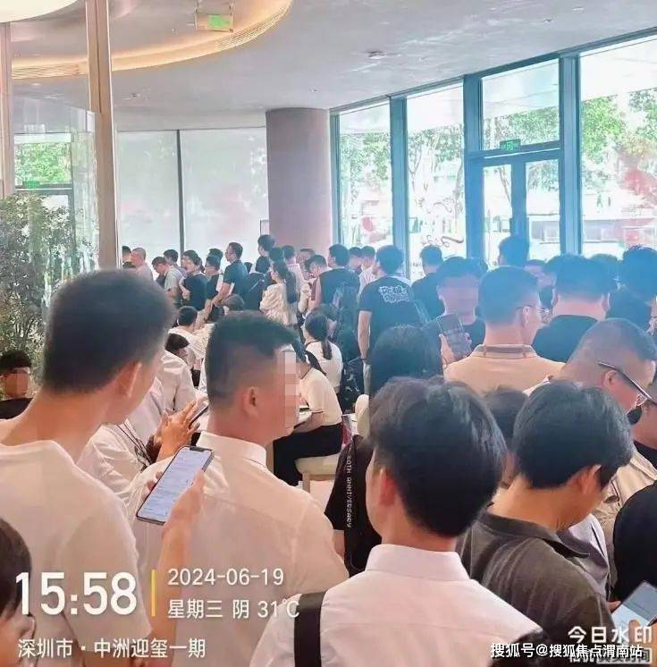 这是位于深圳北站的中洲迎玺项目,二期于昨日(6月19日)晚上拿证,且拿证即开盘,不需要摇号,客户先到先得,因此从昨日下午开始,营销中心就挤满了人群。