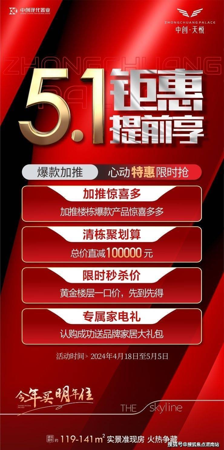 中创·天悦5.1钜惠提前享,加推楼栋爆款产品惊喜多多,清栋聚划算,总价直减100000元,黄金楼层一口价先到先得,认购成功还送品牌家居大礼包,活动时间2024年4月19日至5月5日。