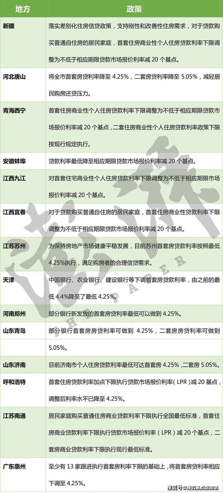 在降低首付、放开限购限售的同时,多地落实差别化住房信贷政策,支持刚性和改善性住房需求,多地首套房贷利率下调至4.25%。
