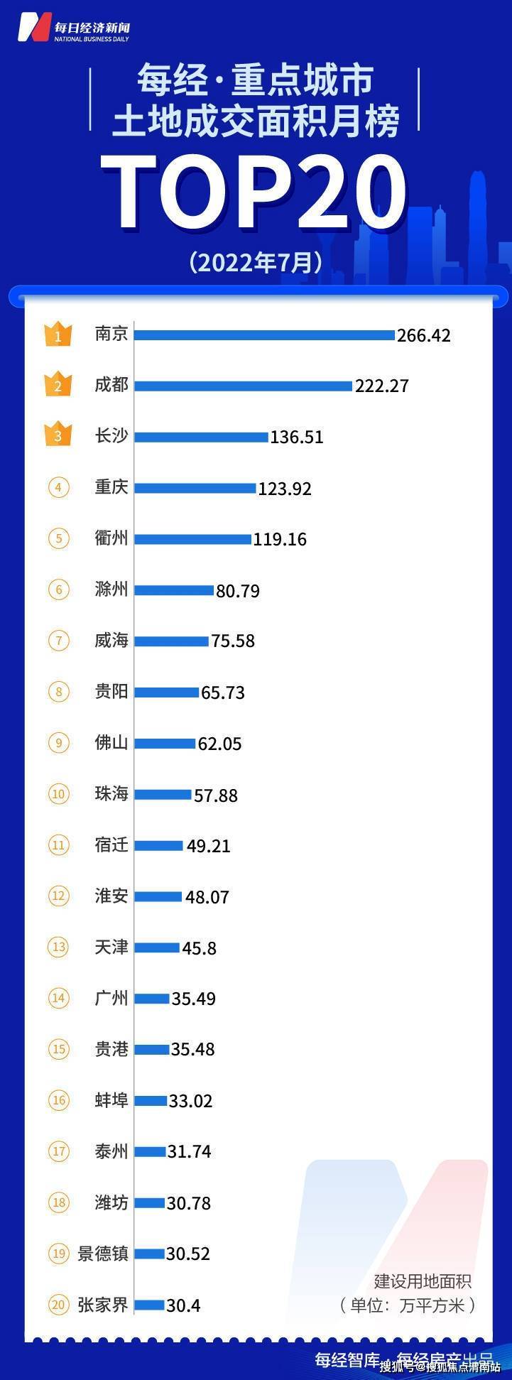 从具体城市来看,南京、成都、长沙位列榜单前三,土地出让面积分别为266.42万平方米、222.27万平方米和136.51万平方米。7月TOP20城市之间土地成交规模差距较大,第20名张家界出让面积仅为30万平方米。