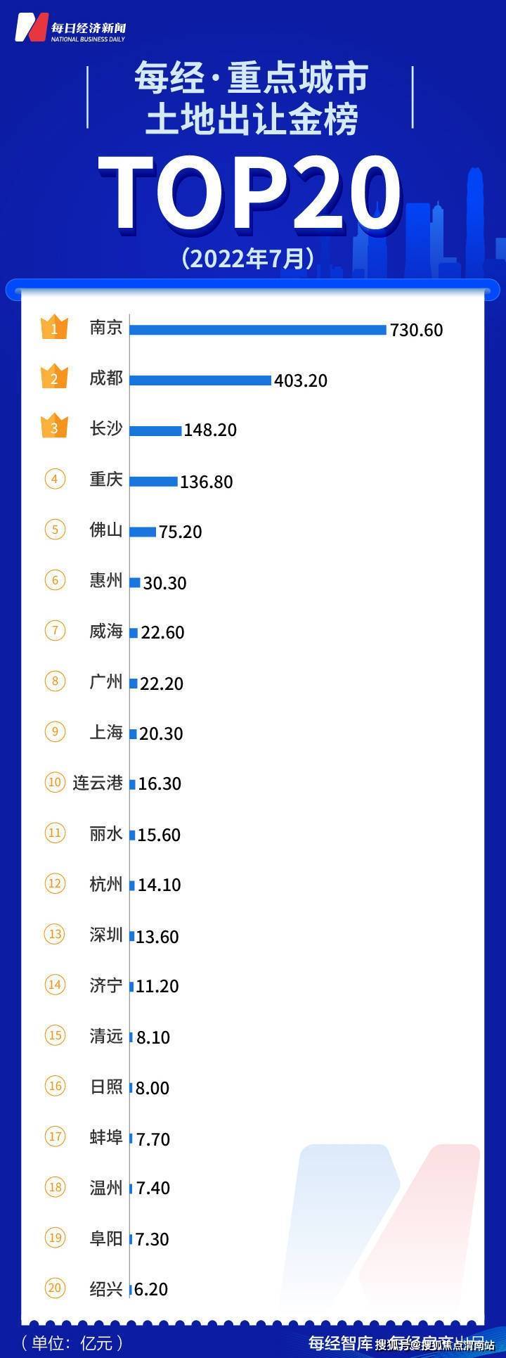 上半年南京仅进行了首轮集中供地,且供地结构变化较大,以730.6亿元位列榜单排名前列,成都和长沙分别以403.2亿元、148.2亿元和136.8亿元分列第二、三、四名。