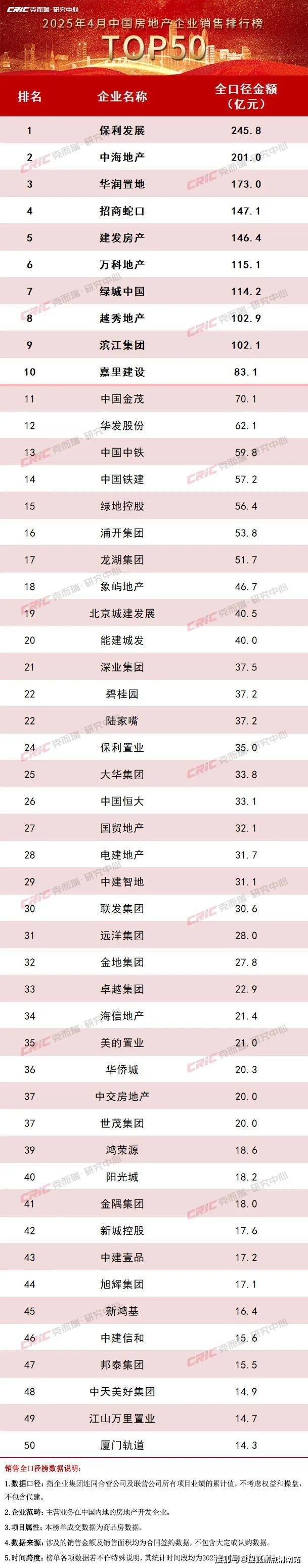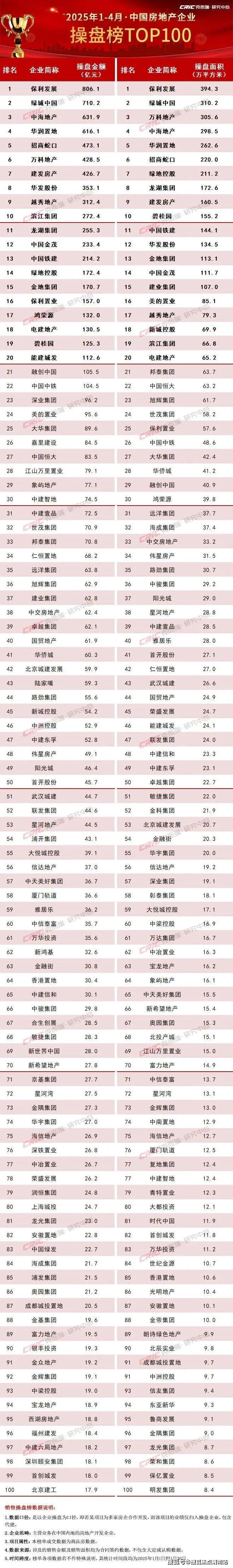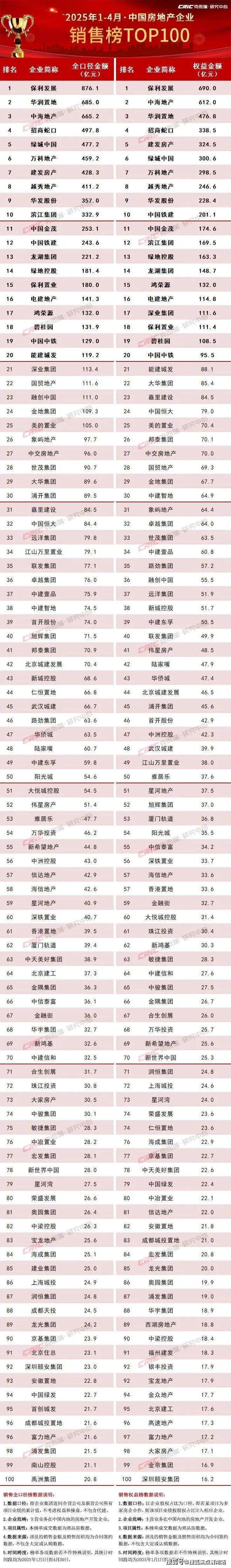 附:《2025年1-4月中国房地产企业销售TOP100排行榜》