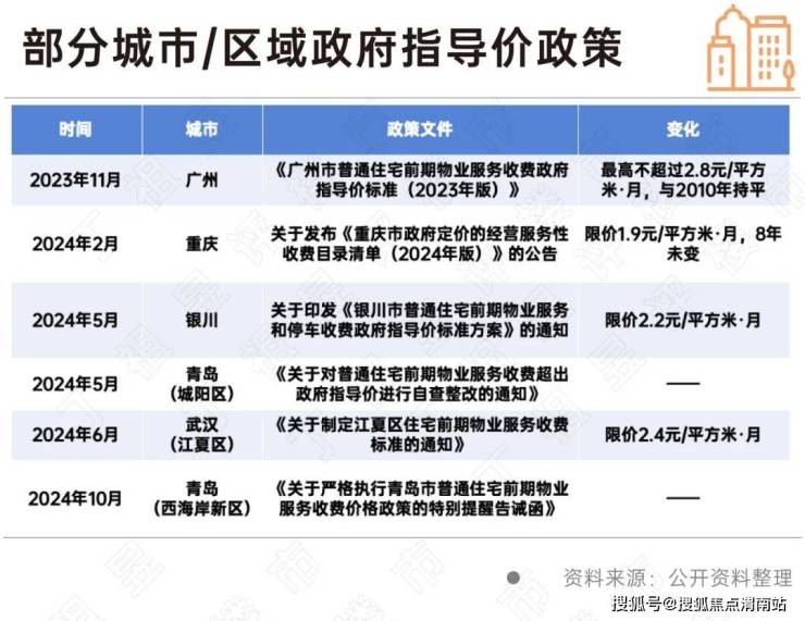 随后2024年5月,银川和青岛城阳区先后发布关于印发《银川市普通住宅前期物业服务和停车收费政府指导价标准方案》的通知及《关于对普通住宅前期物业服务收费超出政府指导价进行自查整改的通知》。