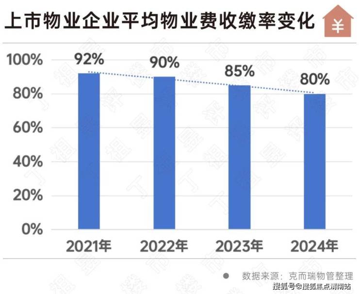 据克而瑞物管统计,2021年至今,上市物企平均物业收缴率已从92%跌至2024年的80%。