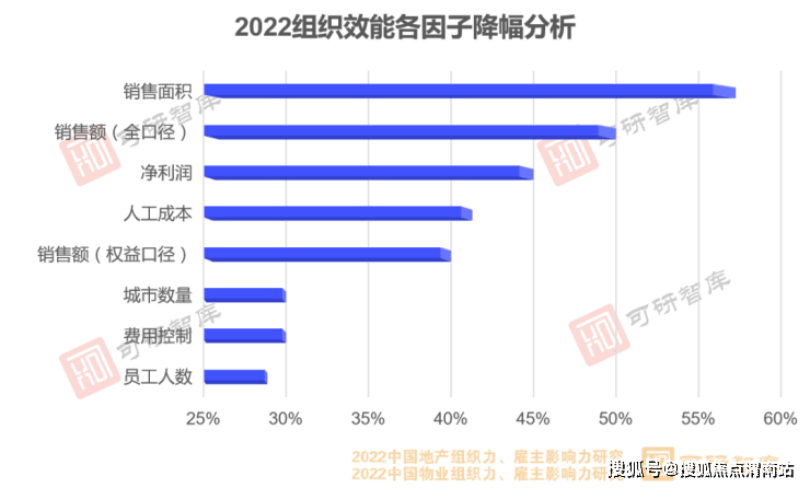 2022年受市场调整影响,百强房企业绩呈现不同程度下滑,以销售面积为例,降幅接近60%,而员工人数、企业总人工成本等管理因素的调整幅度分别为28.88%和41.32%。