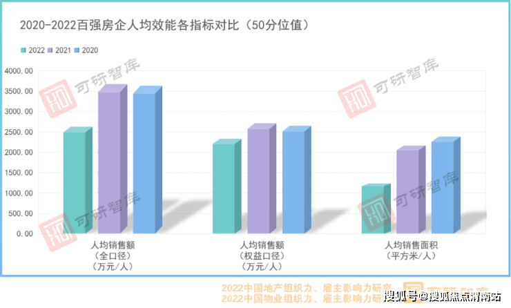 2022年,由于市场调整与管理优化的相互作用。以人均效能、元均效能为代表的组织效能指标体系呈现出20%以上的降幅。以人均效能50分位值为例,人均销售额(权益口径)降幅最低,约为14.29%,人均销售面积降幅最大,达到42.85%。