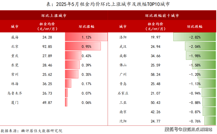 报告显示,租金环比上涨的城市中,威海(1.12%)、北京(0.95%)和重庆(0.43%)位居涨幅前三。其中,威海受今年旅游热度上升,租金整体呈上升局面;北京由于临近毕业季,受到强产业配套支持,业主对租金预期有所提升。