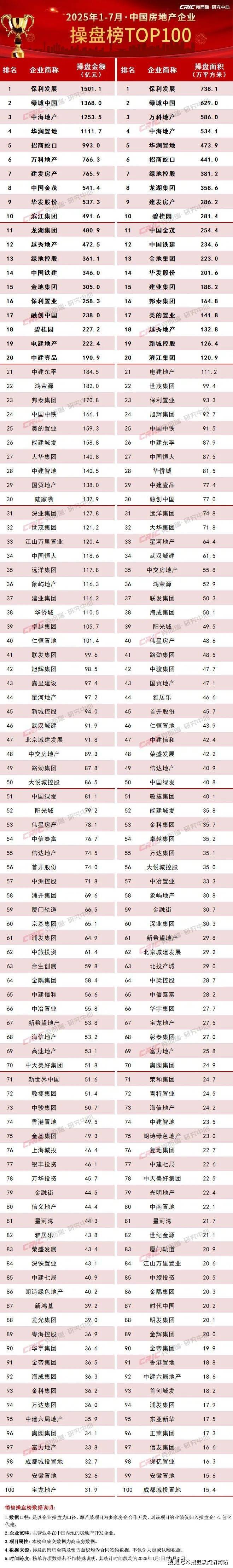 2025年1-7月中国房地产企业销售TOP100排行榜