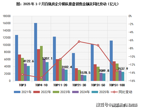 具体分梯队来看,2025年前7个月百强房企各梯队中,TOP21-30和TOP31-50两个梯队房企的累计销售规模降幅相对较小。