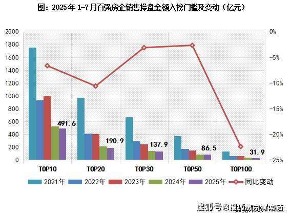 从百强房企规模门槛来看,2025年7月各梯队房企的销售操盘金额门槛都有所降低。