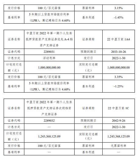 根据《中国人民银行准予行政许可决定书》(银市场许准予字 [2020]第4号)和银行业信贷资产登记流转中心《信贷资产证券化信息登记编码发放通知书》,由中国银行股份有限公司作为发起机构和委托人、建信信托有限责任公司作为受托人和发行人,委托招商证券股份有限公司作为牵头主承销商及簿记管理人,委托中国国际金融股份有限公司、 中国工商银行股份有限公司作为联席主承销商,采用公开簿记建档的方式发行的中盈万家2022年排名前列期个人住房抵押贷款资产支持证券优先A-1档资产支持证券(证券简称:22中盈万家1A1 ,证券代码: 2289028 )、中盈万家2022年排名前列期个人住房抵押贷款资产支持证券优先A-2档资产支持证券(证券简称:22中盈万家1A2 ,证券代码: 2289029)、中盈万家2022年排名前列期个人住房抵押贷款资产支持证券优先A-3档资产支持证券(证券简称:22中盈万家1A3,证券代码: 2289030 )、中盈万家2022年排名前列期个人住房抵押贷款资产支持证券优先A-4档资产支持证券(证券简称:22中盈万家1A4,证券代码: 2289031 )、中盈万家2022年排名前列期个人住房抵押贷款资产支持证券次级档资产支持证券(证券简称:22中盈万家1C,证券代码:2289032) 已公开配售结束,发行总额为13,074,368,125.09 元。