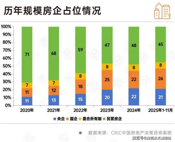 2020年时,全口径销售金额TOP100房企中有71家为民营企业,到了2023年,减少至50家以下,达47家。截至2025年11月,百强房企中民营房企为45家。
