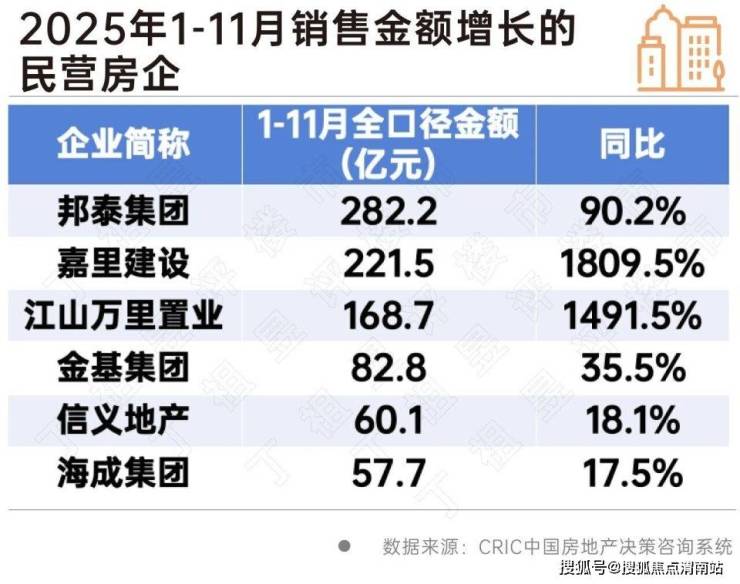然而,从销售变化来看,2025年1-11月仍有6家民营房企销售金额同比逆势增长,其中嘉里建设、江山万里置业、邦泰集团增长超过50%。