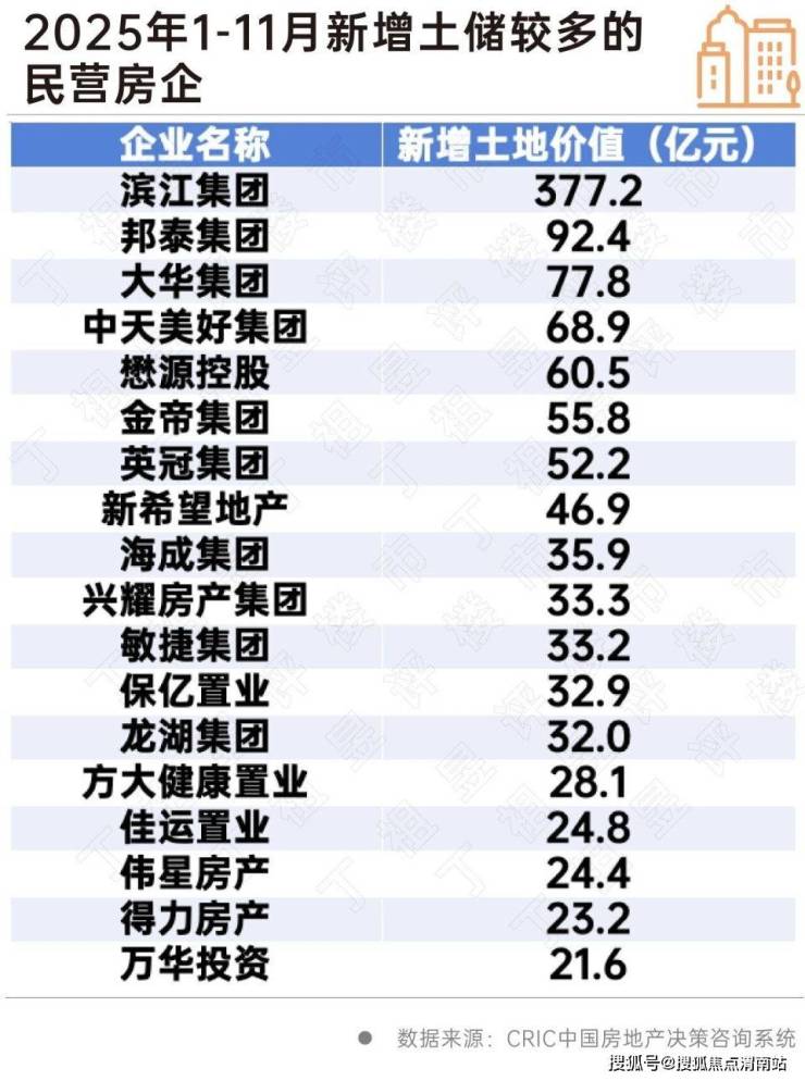 从近两年的新增土地来看,2025年1-11月新增土地价值较高的房企中出现了18家民营房企,是2024年全年的两倍,既有深耕当地持续拿地的企业如海成等,也有在核心城市“横空出世”拿下热点地块的企业,如北京懋源控股、上海佳运置业等。
