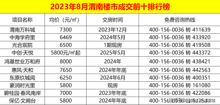 据搜狐焦点渭南站统计,2023年8月渭南新房成交TOP10楼盘分别为:渭南万科城、中海学府里、光合宸院、中创·天悦、鸿基世业万和府、惠风天和、东原玖城阅、豪润时光里、碧桂园·春风南岸、保亿·文阙台。
