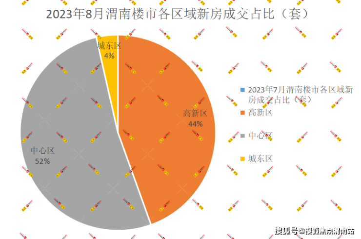 根据搜狐焦点网数据中心统计,2023年8月,渭南中心区域新房成交占比52%位列第一,高新区成交量占比44%,城东区成交量占比4%。