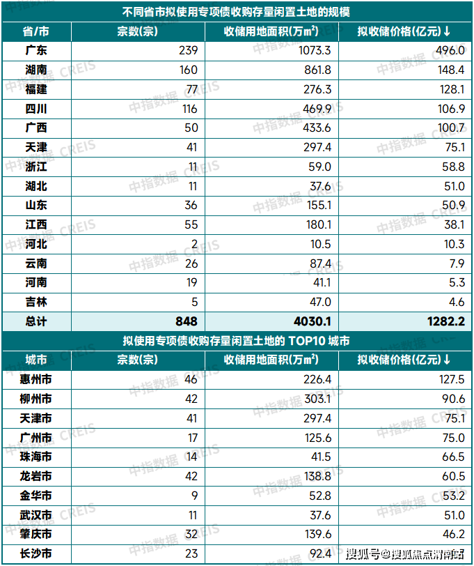 根据中指研究院不完全统计,截至4月10日,全国各地公示拟使用专项债收回收购存量闲置土地的数量约850宗,总面积超4000万平方米,总金额达1282亿元。