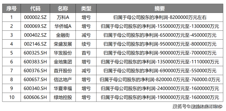 除上述企业外,金融街、荣盛发展、华发股份、首开股份、信达地产的预亏额也均在50亿元以上。