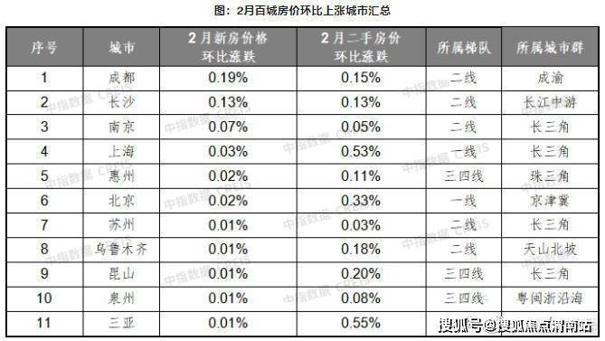 具体来看,环比上涨的城市中,成都涨幅最大,为0.19%;南京、杭州、上海、北京环比分别上涨0.07%、0.06%、0.03%、0.02%;2月广州新建住宅价格环比持平。