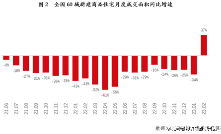 据易居研究院的监测,全国60城新房成交面积的同比增速在2021年6月开始由正转负,为-8%,此后降速持续扩大,到2022年4月同比下滑达到了61%的高点。尽管随后各地均出台了一系列稳楼市新政出台,但效果并不显著。直到今年2月,在经历了20个月的持续下降后,60城新房成交面积首次出现积极信号,首次转正且增速达到了37%。