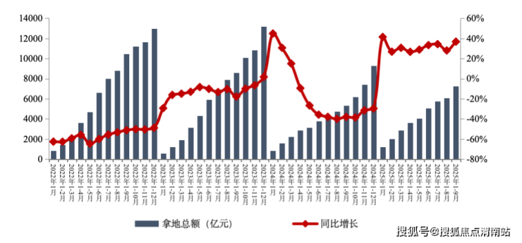 2022年1月-2025年9月TOP100房企累计拿地总额及同比情况 图源:中指研究院