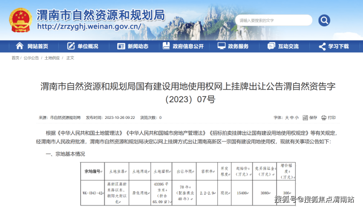 根据《中华人民共和国土地管理法》《中华人民共和国城市房地产管理法》《招标拍卖挂牌出让国有建设用地使用权规定》等有关规定,经渭南市人民政府批准,渭南市自然资源和规划局决定以网上挂牌方式出让渭南高新区一宗国有建设用地使用权,现就有关事项公告如下: